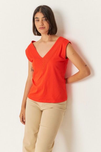 Camiseta sin mangas con cuello de pico y detalles plisados en el escote. Corte recto.