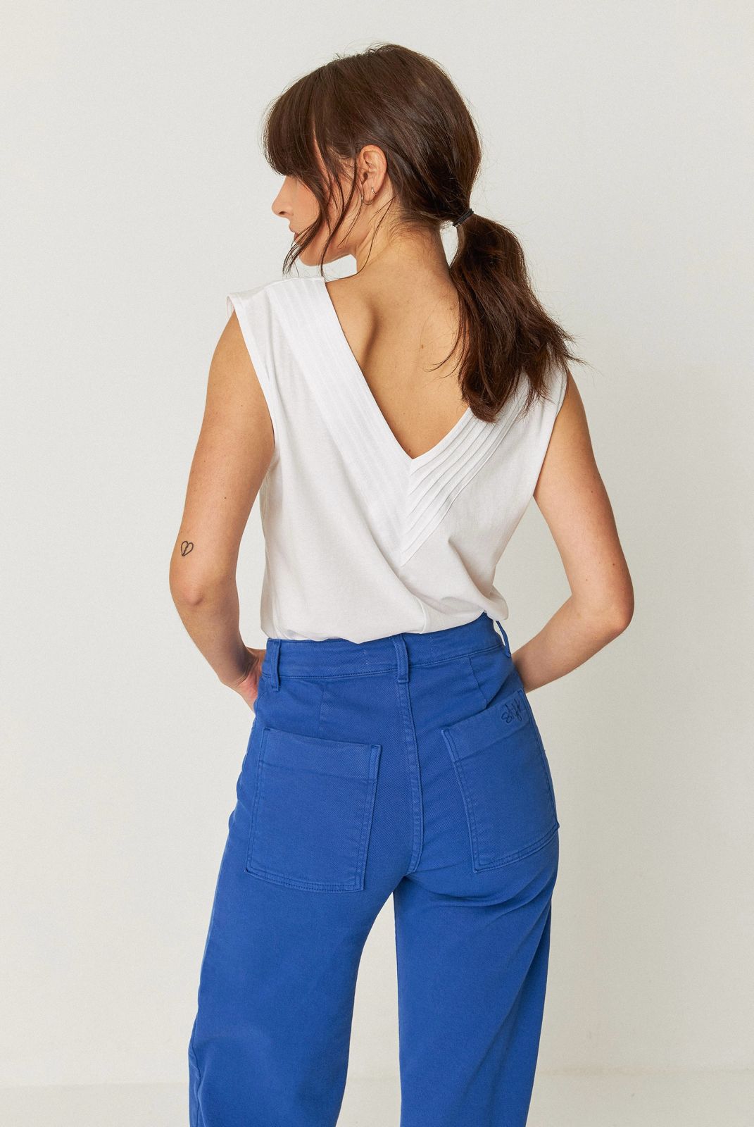 Camiseta sin mangas con cuello de pico y detalles plisados en el escote. Corte recto.