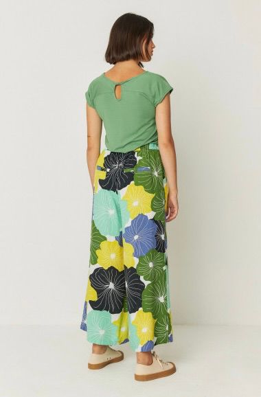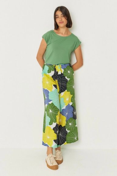 Pantalón palazzo con cinturilla elástica, cinturón anudado y bolsillos delanteros.