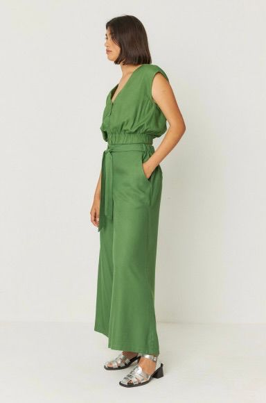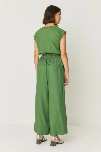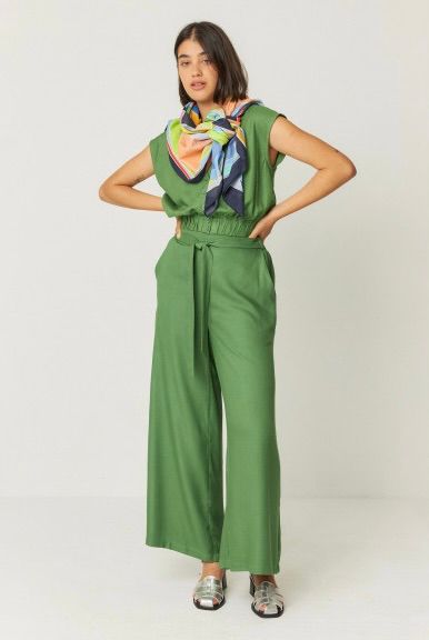 Pantalón palazzo con cinturilla elástica, cinturón anudado y bolsillos delanteros.