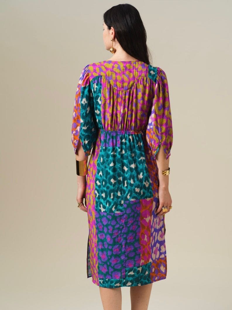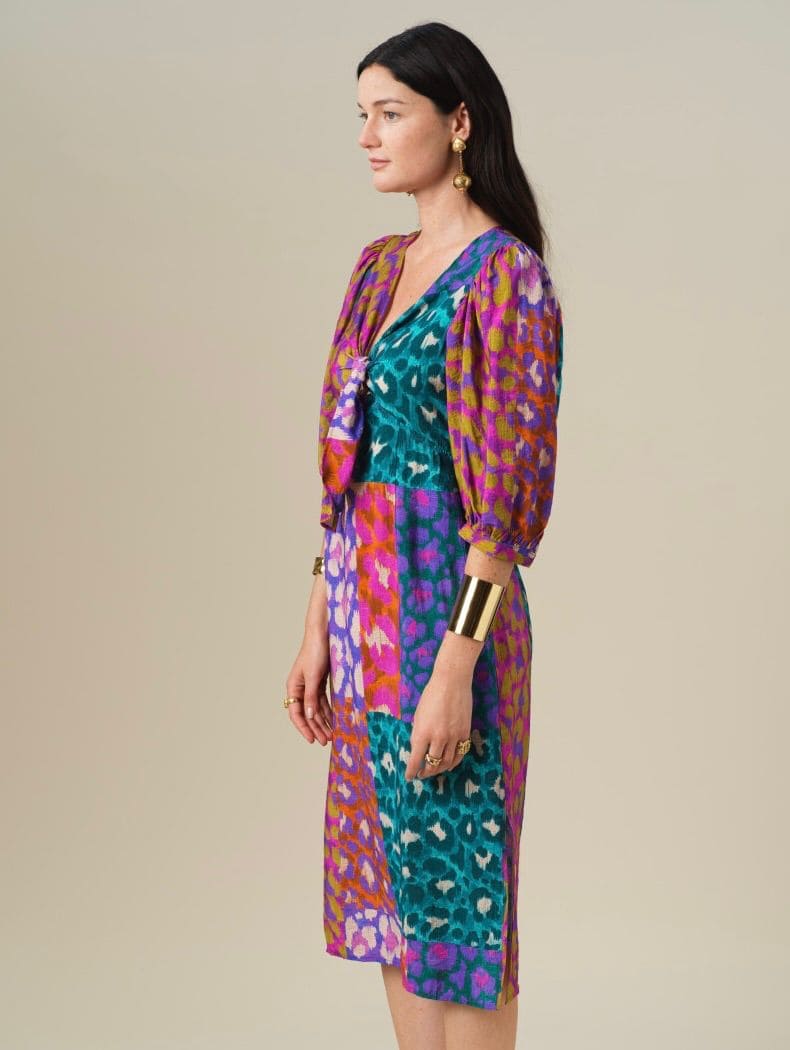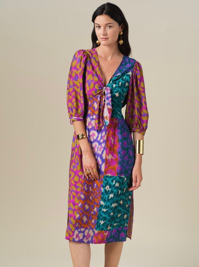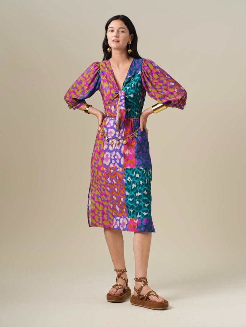 Vestido midi entallado, manga abullonada y escote anudado.