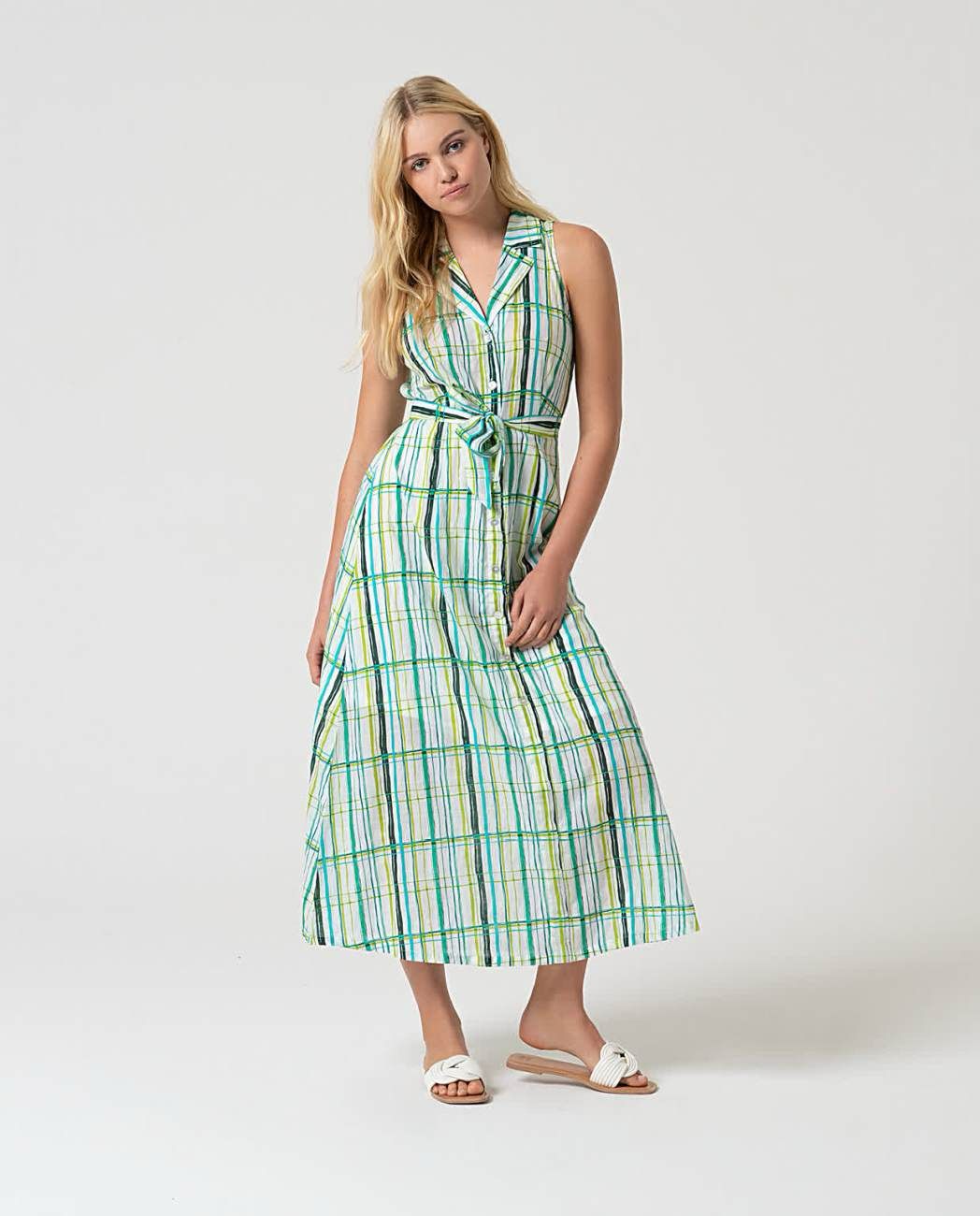 Vestido camisero sin mangas con corte en la cintura y cinturón del mismo tejido.