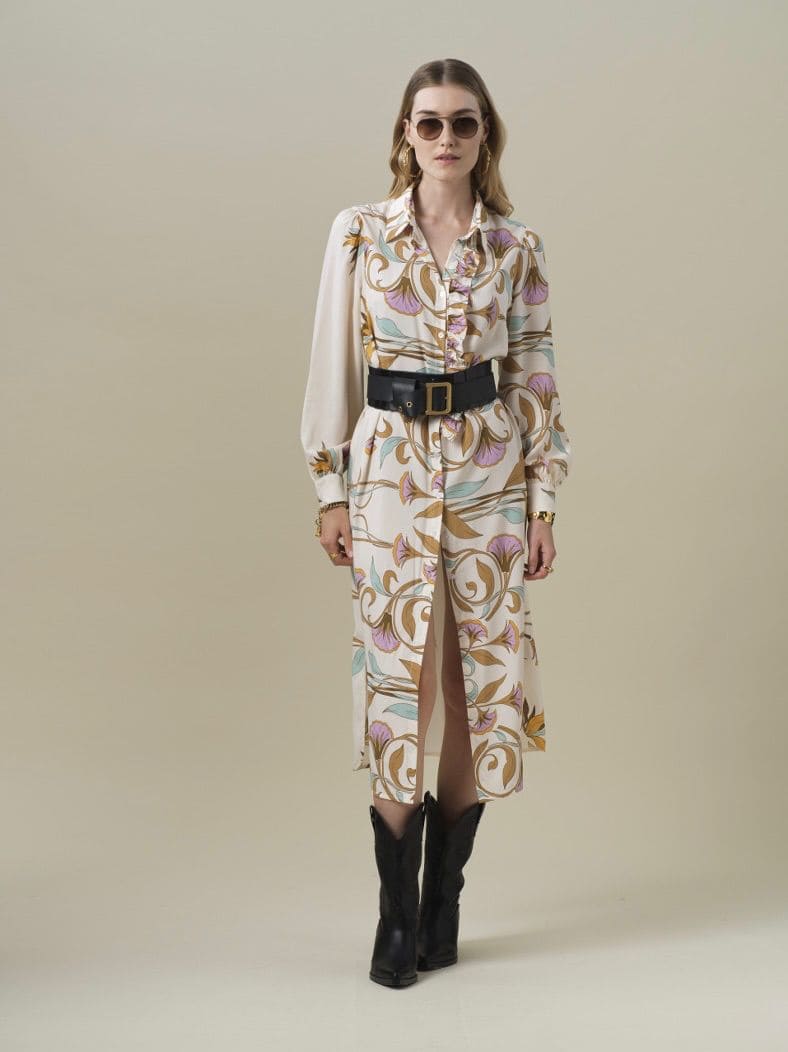 Vestido camisero largo con volante en la parte delantera. Fluido.